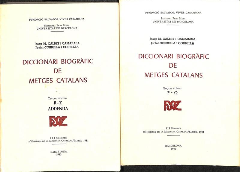 • DICCIONARIO BIOGRÀFIC DE METGES CATALANS 2 VOL ( F-Q/ R-Z)